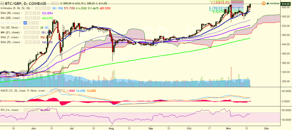 BTC/GBP is continuing its uptrend and is currently trading at 613.86 levels at the time of writing (Coinbase).