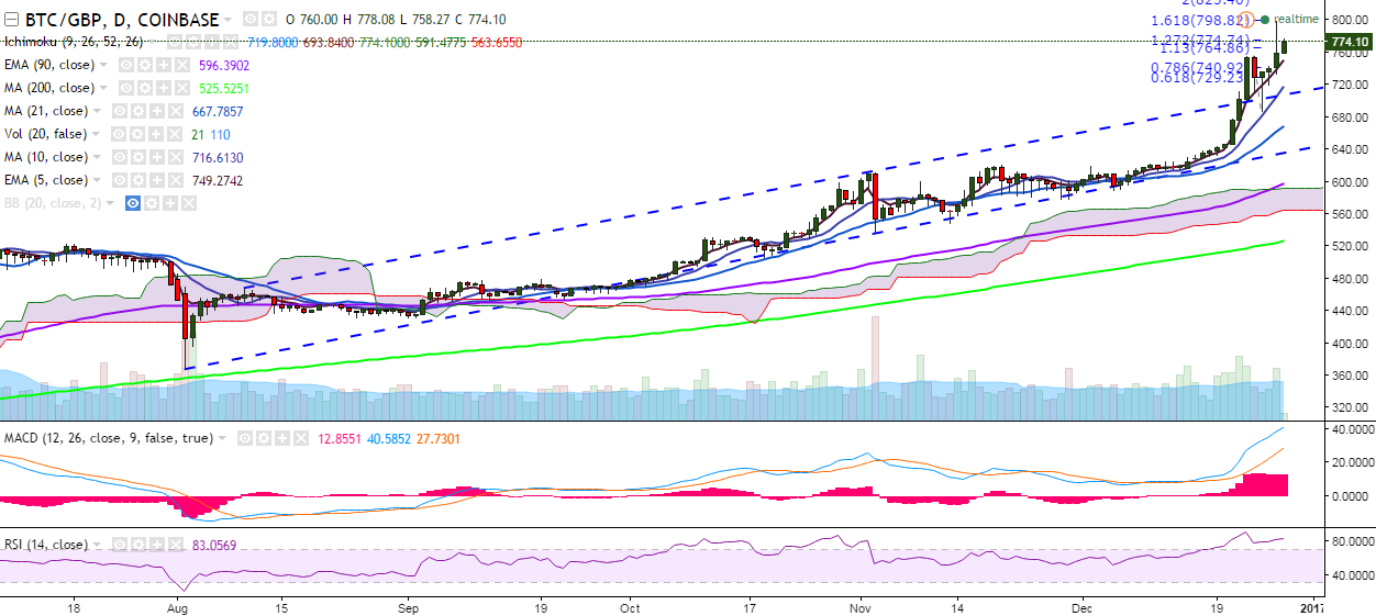 BTC/GBP soared to 799 levels on Tuesday before closing at 760 levels. It is currently trading at 774 levels at the time of writing (Coinbase).