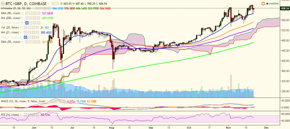 BTC/GBP fell to 583 levels after it hit a fresh high of 621.47 levels on November 20. It has restored its strength above the 600 mark and is currently trading at 606 levels at the time of writing (Coinbase).
