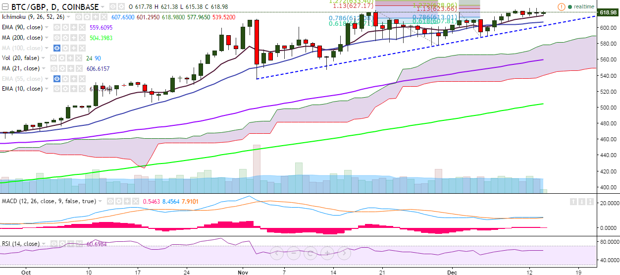 BTC/GBP is facing strong resistance at 625 levels and is currently trading at 618 levels at the time of writing (Coinbase).