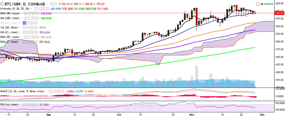 BTC/GBP is trading rangebound on Monday between 589 and 598 levels. It is hovering around 21-day MA and is trading at 591 levels at the time of writing (Coinbase).