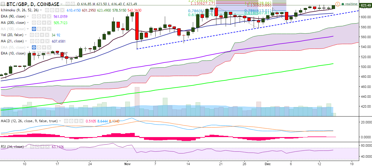 BTC/GBP continued trading in a tight range with its upside capped by 625 levels. It is currently trading at 623 levels at the time of writing (Coinbase).