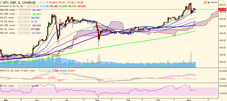 BTC/GBP upside is still being capped by 10-day MA and the pair has failed to break above this level. It is currently trading at 572.65 levels (Coinbase).