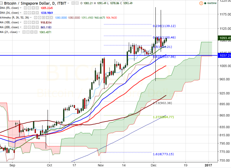 Long-term trend remains to be bullish. BTC/SGD is facing psychological resistance at 1100 and any close above that level confirms minor bullishness.