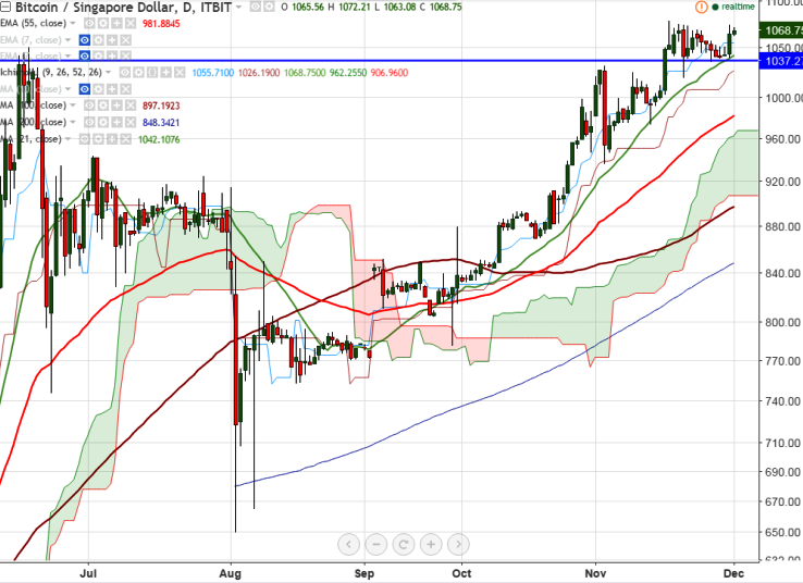 BTC/SGD is seen trading well above on Thursday. The pair has jumped once again till 1075 and slightly declined from that level (ITBIT). It is currently trading around 1071.18 at the time of writing.