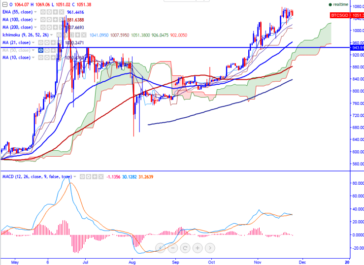 Long-term trend remains to be bullish. BTC/SGD is seen facing a strong resistance at 1075. Any break above will take the pair to next level till 1160.