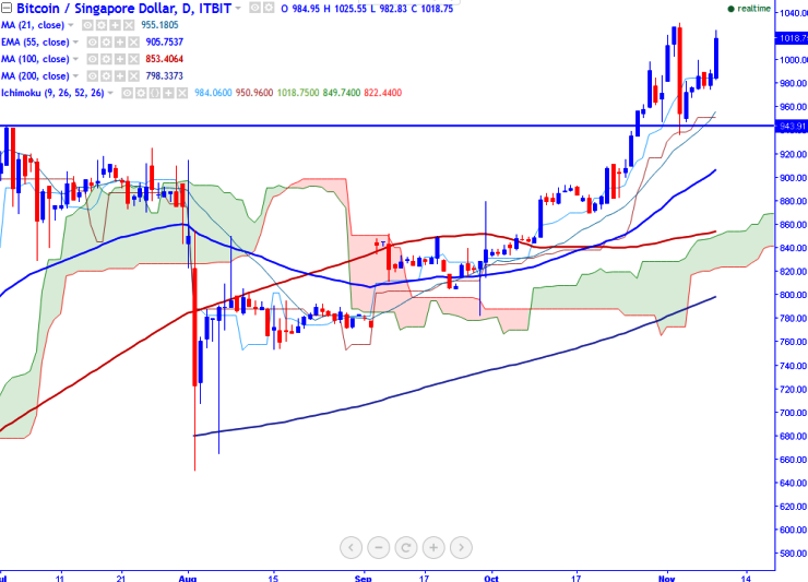 BTC/SGD is seen trading well above on Wednesday. The pair has broken psychological resistance around 1000 and jumped till 1025 levels (ITBIT). It is currently trading around 1019 at the time of writing.
