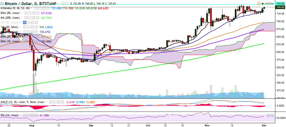 BTC/USD soared higher on Wednesday after trading flat for couple of days. The pair has broken above 10-EMA and is trading at 747 levels at the time of writing (Bitstamp).