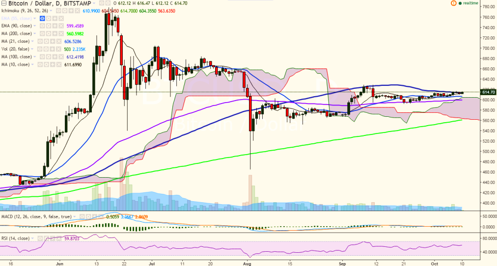 BTC/USD has broken above 100-day MA and has hit 616.47 levels so far in the day. It is currently trading at 614.50 levels (Bitstamp).