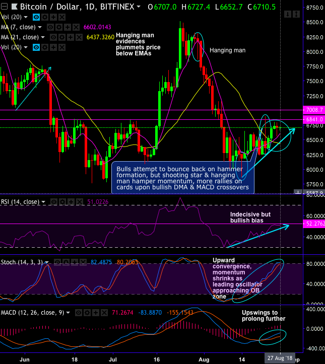 Today, although BTCUSD prices have attempted to bounce back from the lows of $6,652.7 levels to the current $6,722 levels, sharp shooting star and hanging man patterns have occurred previous weeks at $6,363.80 and $6,707 levels that signal bearish sentiment on the news of US SEC’s rejection of series of ETF proposals from three different companies. The previous bullish momentum also seems to be shrinking away.