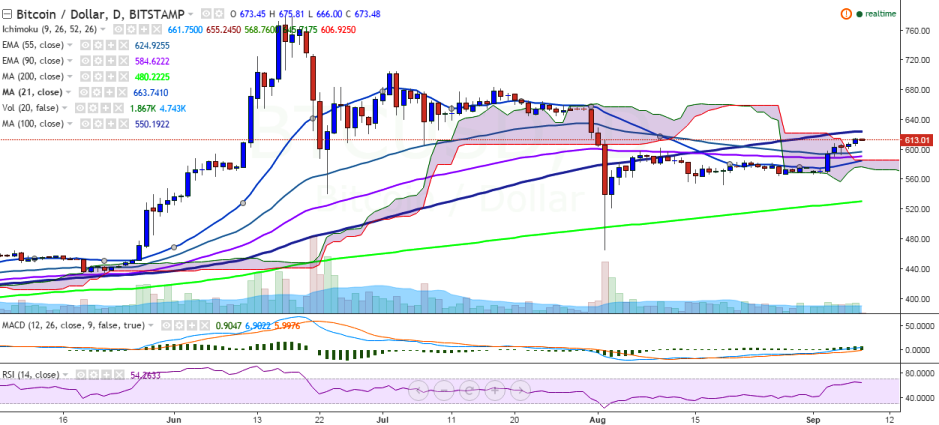BTC/USD is continuing its upward trend and looking to break above 100-day MA. The pair hit a fresh high of 615.92 levels on Wednesday and is currently trading at 613.98 levels at the time of writing (Bitstamp).