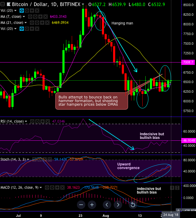 Yesterday, although BTCUSD prices have attempted to bounce back from the lows of $6,350 levels to the recent highs of $6,527.2 levels, a sharp shooting star has occurred yesterday at $6,363.80 levels to signal bearish sentiment on the news of US SEC’s rejection of series of ETF proposals from three different companies.