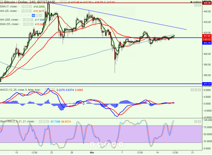 - BTC/USD major resistance is around $425 and break above targets $450/$465.