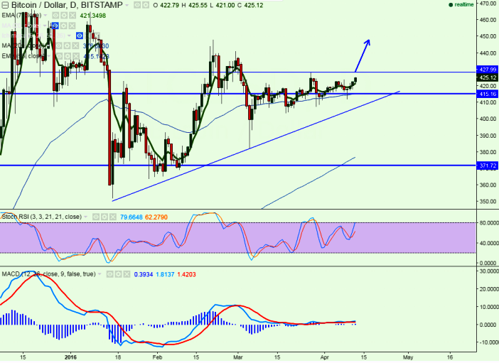 BTC/USD faces strong resistance at $428, break above targets $450/$465.