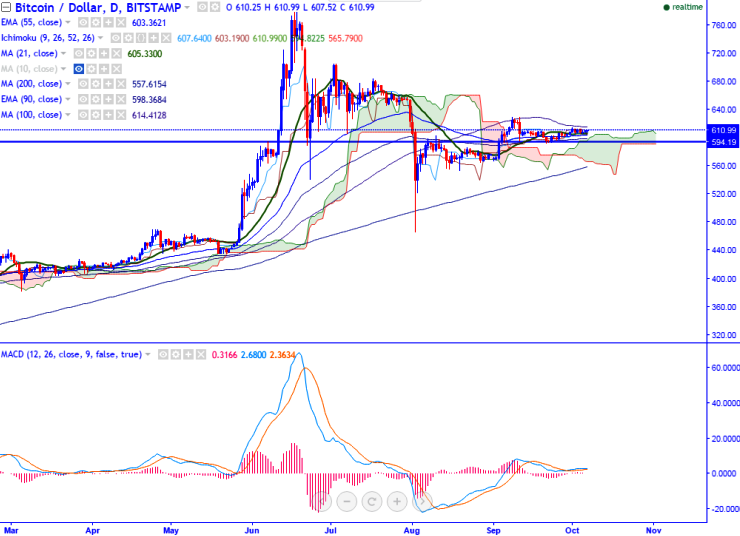 BYC/USD is seen trading above on Friday. The pair is trading in a narrow range between $614.28 and $604.99 for the past six trading sessions (BITSTAMP). It is currently trading at $610.18 at the time of writing.