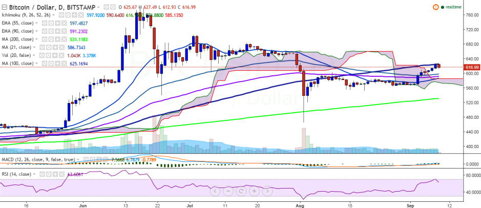 BTC/USD is trading in the red after hitting 100-day MA. The pair hit a fresh high of 628.98 levels on Thursday and failed to hold its strength above 100 DMA. It is currently trading at 615.22 levels (Bitstamp).