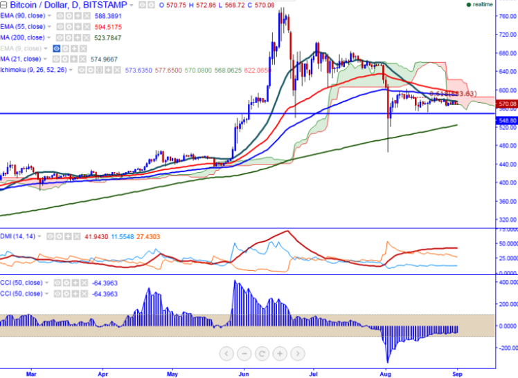 BTC/USD has once again retreated after making a high of $576. It is currently trading at $568.84 (Bitstamp).