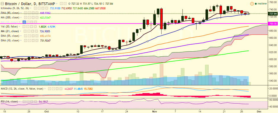 BTC/USD is trading in a narrow range between 724 and 731 levels on Monday as it faces resistance from 10-EMA (Bitstamp).