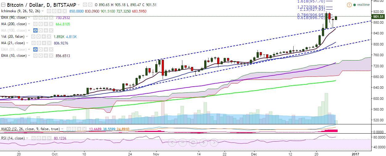 BTC/USD declined to 859 levels after hitting a high of 920 levels on December 23. The pair is now once trying to break above the 900 mark and is trading at 901.69 levels at the time of writing (Bitstamp).