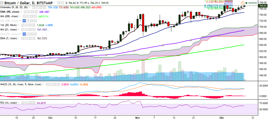 BTC/USD is gradually inching closer to previous high of 778.07 levels and is currently trading at 770 levels at the time of writing (Bitstamp).