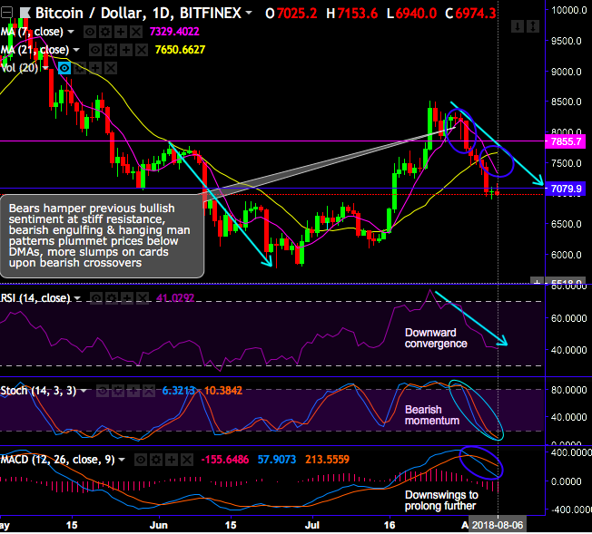 Ever since then, the price has constantly been dipping below DMAs and for now, plunged below $7,000 mark. While the bears have hampered the previous bullish sentiment at the stiff resistance of $8503 - $7855.7 areas, more slumps on cards upon intensified bearish momentum signalled by leading oscillators (RSI & stochastic curves) and bearish crossovers indicated by trend indicators (DMAs and MACD).