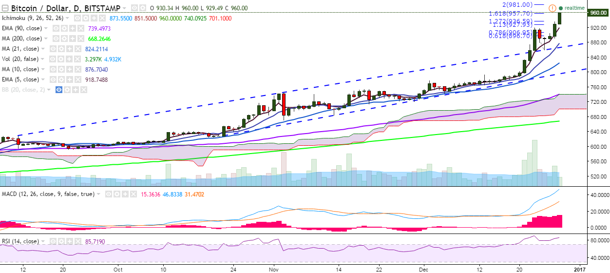 BTC/USD broke above the previous high of 920 levels on the back of newly found momentum and is currently trading at 957 levels (Bitstamp).