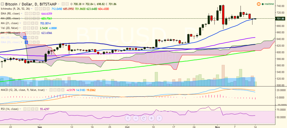 The surge seen recently in BTC/USD as Donald Trump was elected as the 45th POTUS evaporated gradually. The pair fell below the 700 mark on November 13 and is currently trading at 701 levels (Bitstamp).