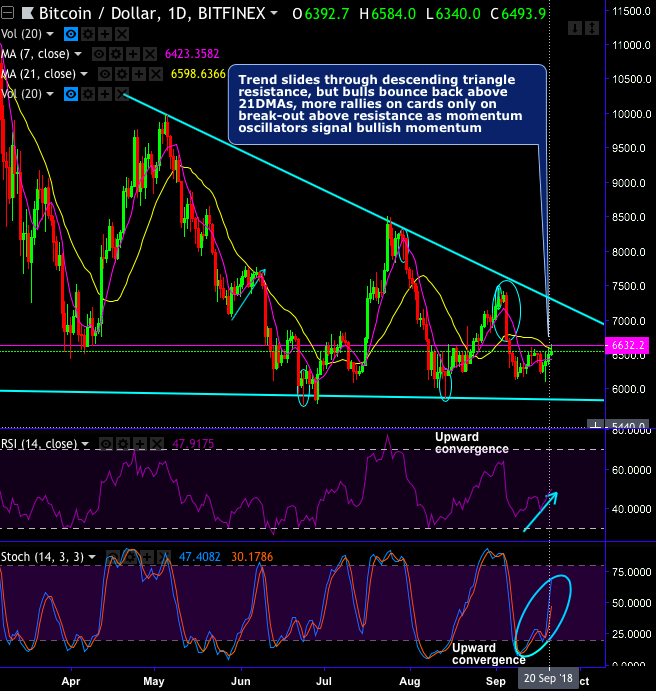 Technically, BTCUSD trend slides through descending triangle, but bulls bounce back above 21DMAs, more rallies seem to be on cards only on break-out above resistance as leading oscillators (both RSI & Stochastic curves) signal bullish momentum (daily chart). While on the major trend, the failure swings were observed at 21EMAs and downward trend-line (refer weekly plotting), trend on this timeframe is wedged between $5,700 - $11,700 levels.