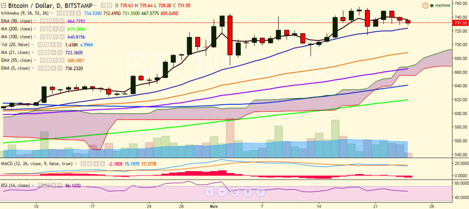 BTC/USD is showing a dip after it ran into resistance at 750 levels. It has slipped below 5-EMA and is trading at 731 levels at the time of writing (Bitstamp).