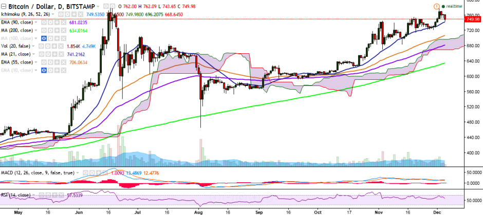 BTC/USD is showing a dip after it hit a fresh high of 778.07 levels on December 02. It is currently trading in the red at 749 levels (Bitstamp).
