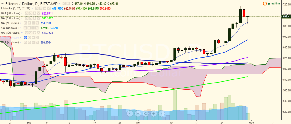 BTC/USD has slipped below the 700 mark after hitting 717.99 levels on October 29. It is currently trading at 696.40 levels (Bitstamp).