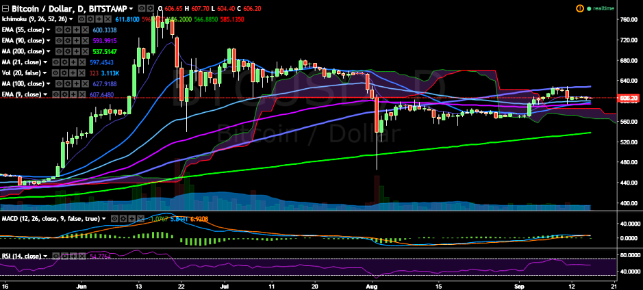 BTC/USD remained largely flat this week, trading in a narrow range between 600-610 levels. It is currently trading at 606.95 levels (Bitstamp).
