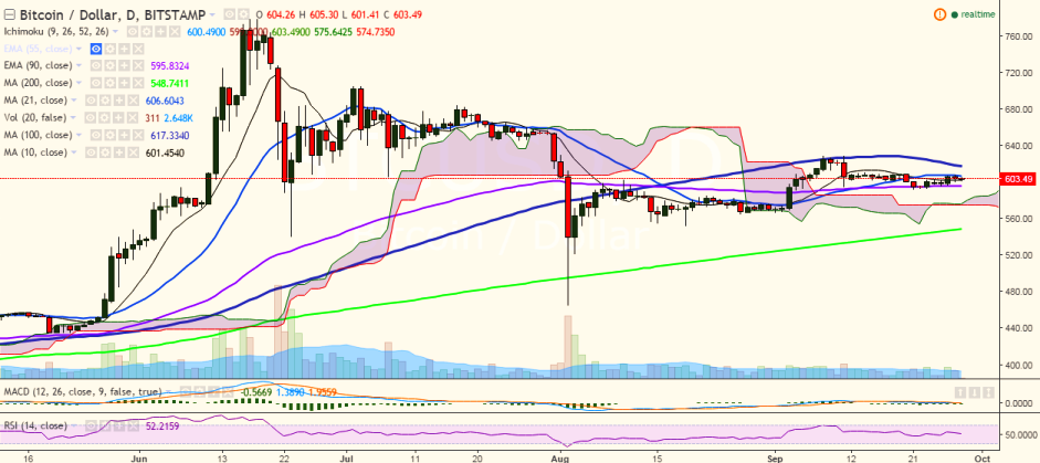 BTC/USD hit a fresh high of 608.37 levels on Tuesday but has failed to close above 21-DMA. It is currently trading at 603 levels.