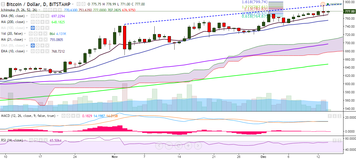 BTC/USD is trading rangebound on Wednesday and is currently hovering around 777 levels at the time of writing (Bitstamp).