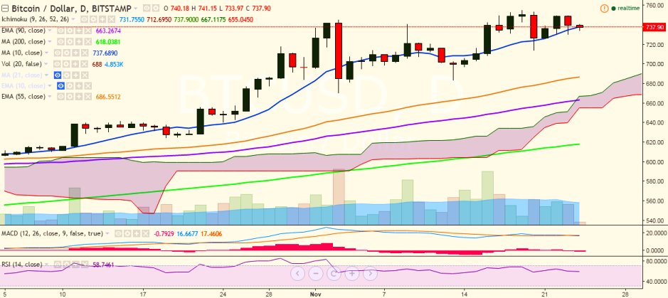 BTC/USD is trading in a narrow range between 733 and 741 on Thursday. It is currently trading at 537 levels (Bitstamp).