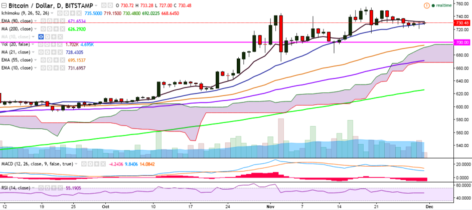 BTC/USD is trading in a tight range on Wednesday, with its movement restricted between 10-EMA and 21-day MA. It is currently trading at 731 levels at the time of writing (Bitstamp).