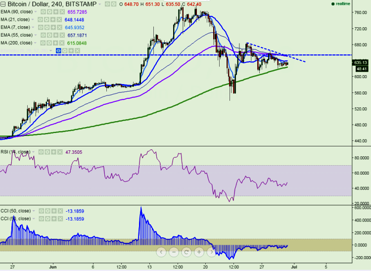 BTC/USD seems to struggling to turn green on Thursday, reversing the downtrend seen from the past two days. It currently trades at $636.92 levels at press time (Bitstamp). In the 4-hour chart, the pair’s northward move is facing major resistance from 21 4H MA.