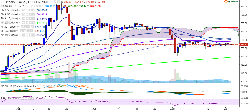 BTC/USD is trading weak on Wednesday and has slipped below 21-day MA. It is currently trading at 576 levels at the time of writing (Bitstamp).