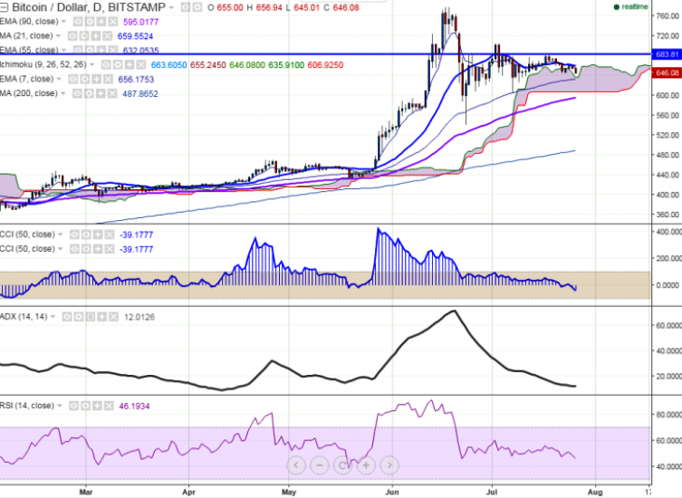The long-term trend remains to be bullish. BTC/USD trades well below 21 days MA ($660). So a decline till $630/$605 is possible.