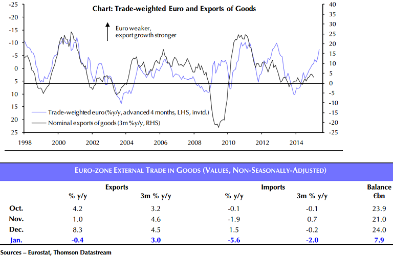 January's euro-zone trade data suggested that the region's exports are still not benefiting substantially from the weakness of the euro.