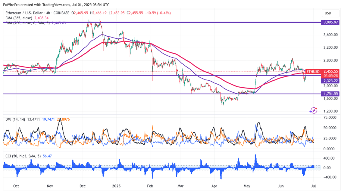 ETHUSD trades flat with positive bias. It hits an intraday low of $2445 and is currently trading around $2454.