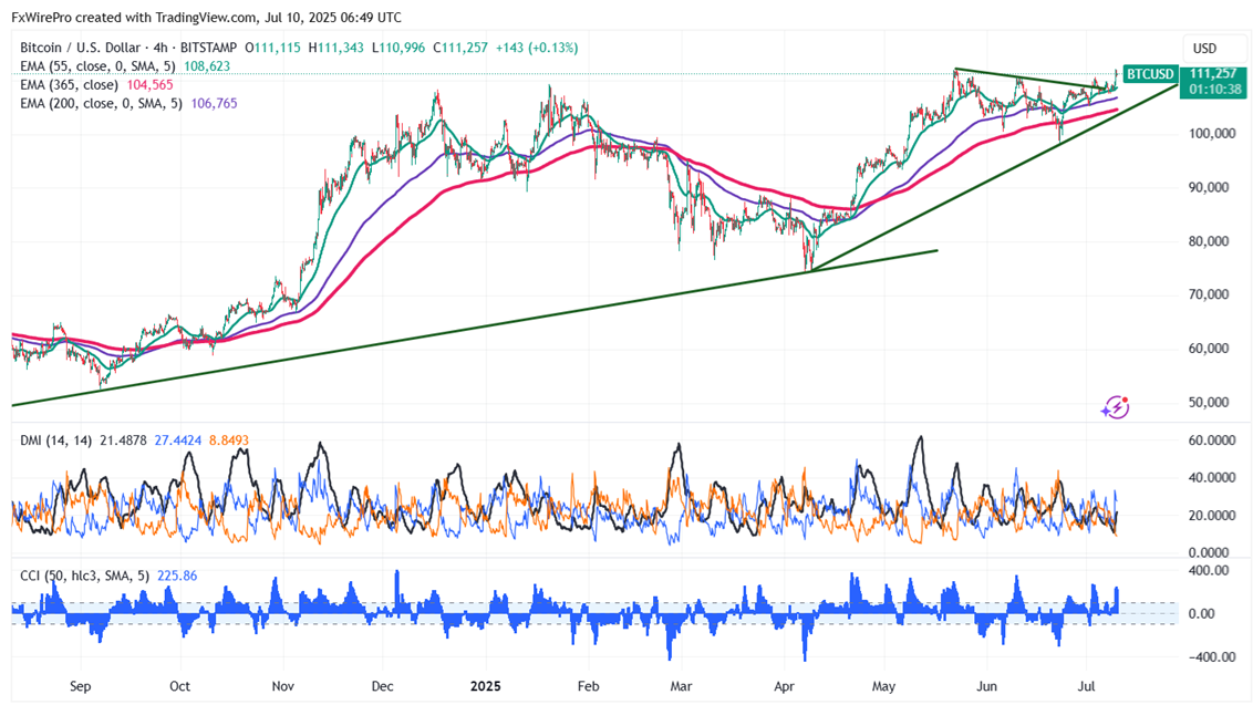 BTC/USD breaks significant resistance $112000 and hits a fresh all-time high. It trades above both short-term (34-EMA and 55-EMA) and long-term (200-EMA) moving averages on the 4-hour chart. Minor support is around $108000; breaking below this would drag the pair down to $103000/$10000/$94660/$90000. Immediate resistance is around $112,000, indicating that closing above this level could lead to targets at $115,000, or even $135,000.
