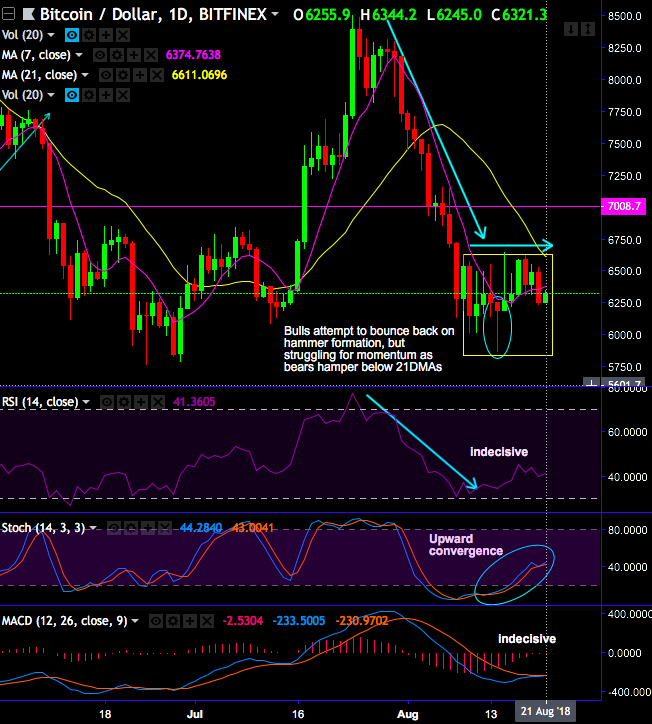 Although the bulls of BTCUSD have attempted to bounce back last week from the lows of $5,858.6 levels bears have resumed yesterday at $6,524 levels (i.e. near 21-DMAs), the bullish momentum is not convincing. As a result, the trend goes in sideways for the day.