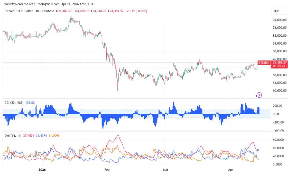 Hopes for a US-Iran truce drove BTCUSD to rise dramatically. On April 11, it reached its highest point of $73,832, and it is currently trading at roughly $74438.