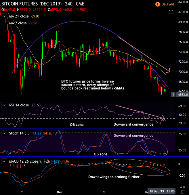 Technically, the price chart of CME BTC futures (of December month deliveries) forms Inverse saucer pattern which is bearish nature, every attempt of bounce back restrained below 7-SMAs (1st chart). So far, it has 9.43% price drops, currently, trading at $6,580 levels.