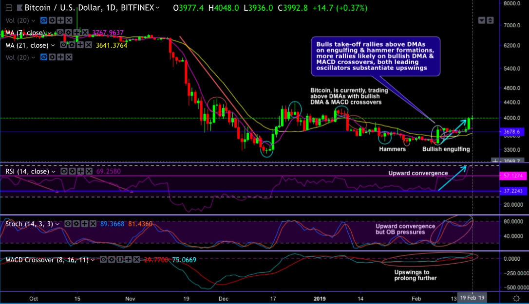 BTCUSD price has surpassed $4k mark today to extend bullish streaks and hit 6-weeks highs. The current price spikes above 7-DMAs with bullish crossovers and intensified buying momentum.
