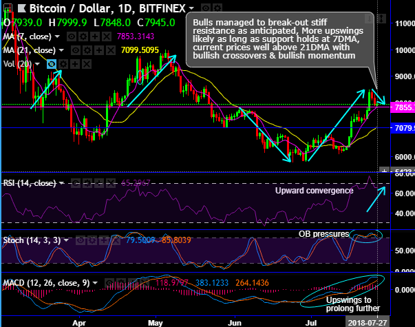 We reiterate BTCUSD prices have been dipping from last 2-3 days on the back of the news that the U.S. Securities and Exchange Commission (SEC) rejected the second attempt of the Winklevoss application to launch a Bitcoin exchange-traded fund (ETF), but the bulls seem to be finding cushion at 7-DMA levels ($7,848 levels) where at this juncture, the pair has acted as its strong support and resistance levels in the recent past.