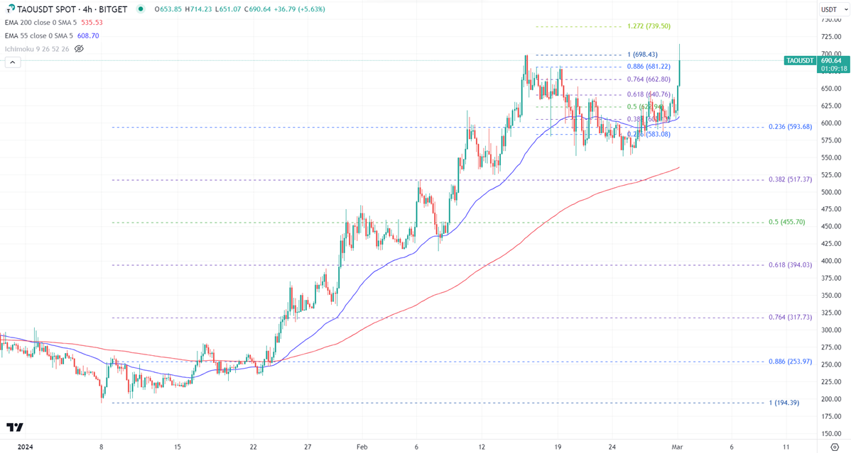 TAOUSD hit an all-time high and surged more than 25% in the past two days.It holds above the short-term (21 and 55 EMA) and above the long-term moving average. It hit a high of $714 and is currently trading around $685.87.