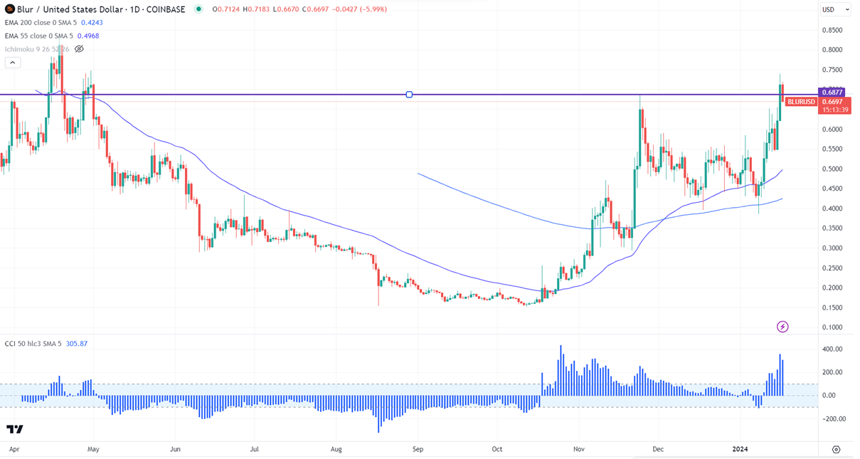 BLURUSD gained more than 90% in the past four days. The pair holds well above the short-term (21 and 55 EMA) and long-term moving average. It hit a high of $0.1029 and is currently trading around $0.1011.