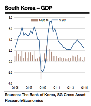 The release of advance GDP figures for Q2 2015 is basically set to be a non-event, as BoK Governor Lee Ju-yeol already disclosed a flash estimate of 0.4% qoq, at the press conference following the MPC meeting on 9 July. He attributed the significant slowdown in GDP growth to the MERS (Middle East Respiratory Syndrome) outbreak and the drought.